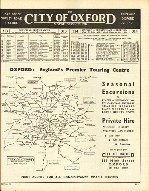 The ABC Coach and Bus Guide contained details for most of the larger bus and coach companies and the usual format featured the complete timetables for express services with an abbreviated list of the main bus services. In most cases there was a map of the relevant company's bus service network. This page shows the content for The City of Oxford Motor Services Limited which, despite its name, had services extending well beyond the city of its name.