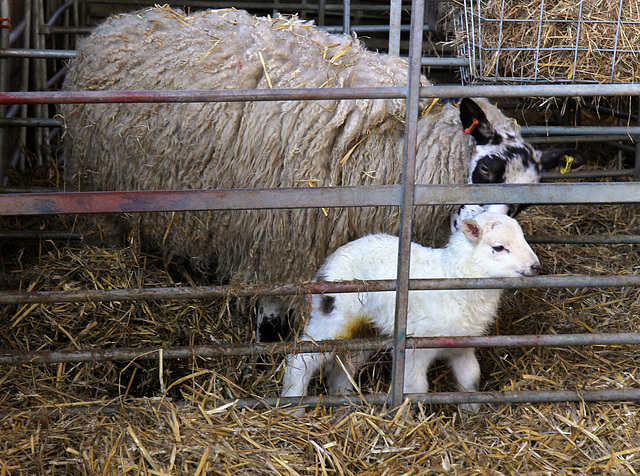 This lamb was born this morning. It hasn't been tagged, the tail hasn't been docked and the ewe and lamb are still in a small pen away from the other pregnant ewes. When I first got here the lamb was lying in the straw and it didn't seem to be breathing at first. But after a couple of nudges, it eventually staggered up onto its feet, still very wobbly.