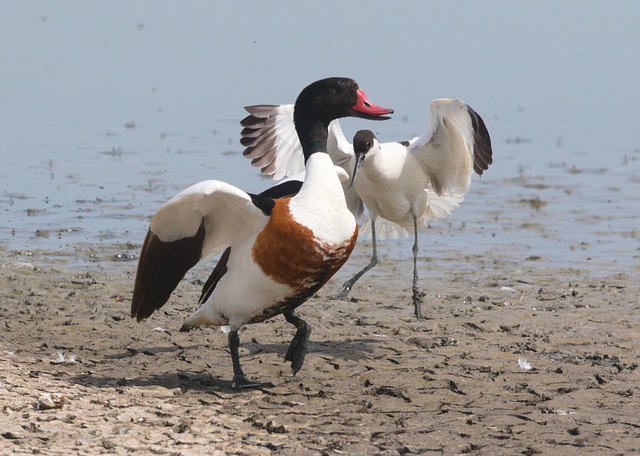 Pied avocet,Recurvirostra avosetta, chasing Shellduck, Tadorna tadorna, Elmley Marshes