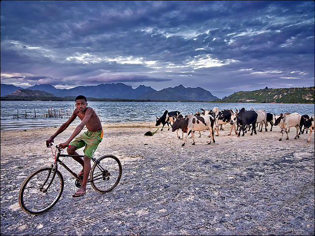 Les puristes (dont je fais partie) pourront dire que le cycliste est mal placé car il va sortir du cadre. Mais comme il se dirige dans le même sens que le troupeau de zébus, tout en s'en détachant, la composition et le sens de la lecture fonctionnent plutôt bien.