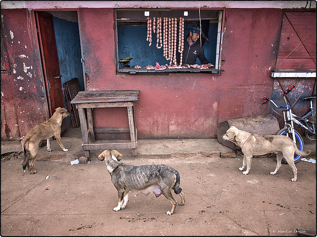 J’ai remarqué que les chiens sont toujours à proximité de ce type de commerce. Ils dorment même la nuit devant les portes pour ne pas rater l’ouverture. De sorte que selon le commerçant qui est sur la photo, les boucheries du quartier sont très bien protégées par cette présence canine.