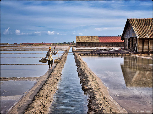 Kampot (Cambodge) - Trois minutes de différence avec la photos suivante. Le porteur de sel a déjà fait un aller et retour. Il se retrouve à peu près au même endroit que sur la précédente image.