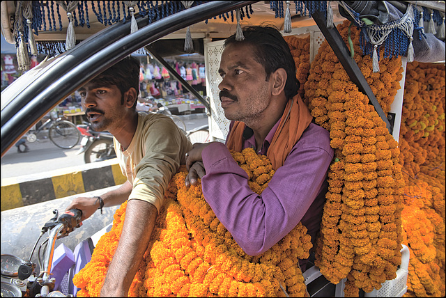Varanasi (Inde) - Le collier de fleurs est une véritable industrie en Inde et plus particulièrement à Varanasi ou passe le Gange. Chaque jour des milliers de colliers sont jetés par les hindous dans les eaux sacrées du fleuve ou posés sur les corps des défunts lors des crémations. Ces offrandes religieuses sont fabriquées à l'unité dans la rue ou dans des ateliers. Les colliers qui sont sur cette photo en raison de la quantité, proviennent d'un atelier professionnel.