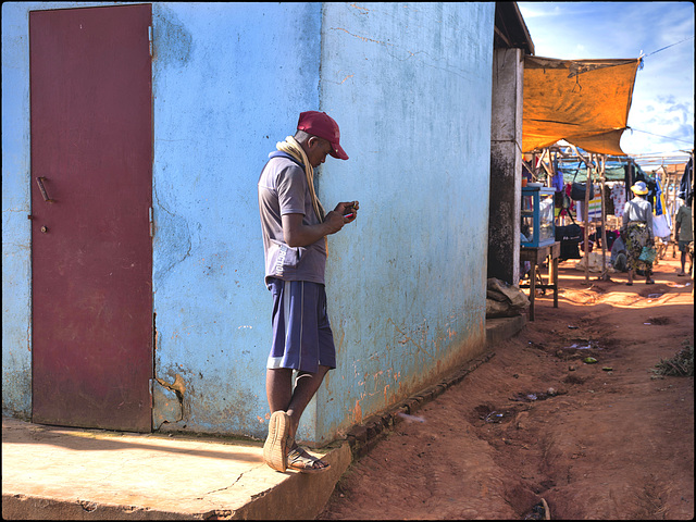 Ambalavao (Madagascar) – J’ai été attiré par le contraste entre la sobriété du bloc sanitaire en béton et le tumulte du marché que l’on devine en arrière-plan. Les couleurs douces du bâtiment et l’attitude décontractée du personnage renforcent ce contraste. Deux scènes en une.
