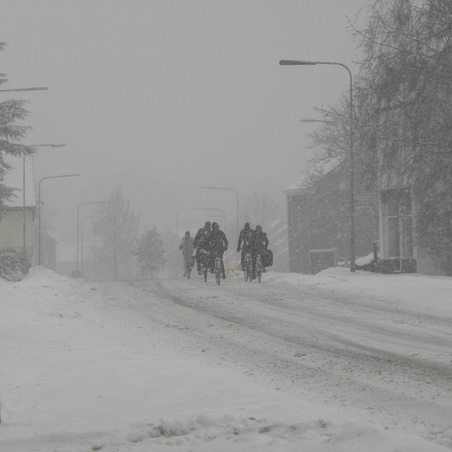 people on bikes-met een groep bij elkaar vang je misschien minder sneeuw dan dat je alleen bent
