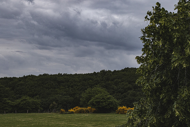 Aber natürlich gab es an diesem Abend kein ähnliches Schauspiel, und so blieb schlussendlich als Motiv des Tages nur diese Abendstimmung, mit den dunklen Wolken und dem leuchtenden Ginster vor dem Wald.