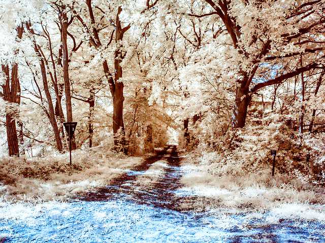 Für die Infrarotfotografie verwende ich folgende Kameras: Panasonic Lumix DMC-FZ28 (für Infrarot modifiziert) mit Objektiv Leica DC Vario-Elmarit 4.8-86.4mm f2.8-4.4 sowie Sony DSC-F828 mit Objektiv Carl Zeiss Vario Sonnar T 7,1-51mm f2-2.8. Bei dieser Kamera kann man durch einen an das Gehäuse gehaltenen Neodym-Magneten den IR-Sperrfilter vor dem Kamerasensor beiseite klappen, so dass Infrarotlic…