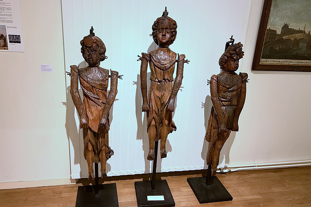 These wooden figures were in the belfry of the tower of the City Hall to strike the bells. The first generation were placed in 1530, the second generation in 1629 and these were the third generation, placed in 1768. They were removed in 1875. They represent the Sun, Moon and a star. Every generation is different. The present versions, called Langlois, Lansquenet and Flandrin (representing the old enemies Spain, England and Flanders), date from 2002.