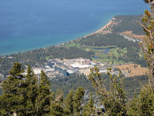 The California line is clearly shown by where the high-rise casino-hotels stop! The prominent thoroughfare running across the photo is US 50/Lincoln Highway. Lake Tahoe is the body of water. Taken from an observation platform on the gondola at Heavenly Ski Resort, which is open for rides during the summer and early fall.