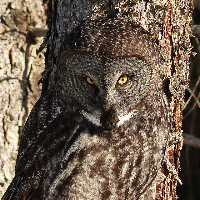 On 10 January 2014, I had to remove my vehicle from the parking lot for the whole day, so that snow removal people could remove some of the snow and ice. I decided that if I drove over to the west of the city and went for a walk, that would kill a few hours. A Great Gray Owl had recently been reported, so I knew I needed to keep my eyes open. Normally, we don't get Great Grays within the city, so this was an exciting find. Shortly after I started walking, I passed someone who had just seen the owl about 20 minutes earlier, so I felt hopeful that it was still there. Further into the park, several other people gradually appeared, and it's always useful to have extra pairs of eyes. Eventually, it was spotted, hidden just within the trees - well hidden! While I was there, it flew along the outer edge of the trees and then in among the trees, giving us some good views each time. When the owl is perched next to a tree trunk, the camouflage is quite amazing. If the owl's eyes are closed or if the head is turned away, they are very difficult to see! When it turns its head, the movement of the white "moustache" can catch ones attention.