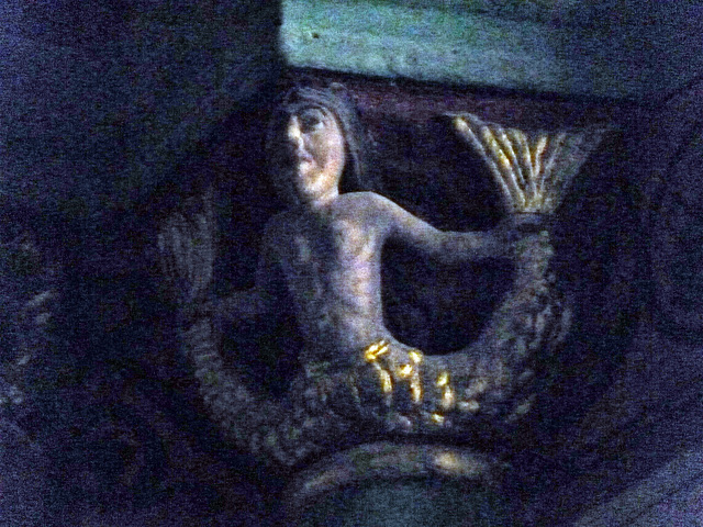 One of the capitals shows the carving of a mermaid. She is very colourful and golden fish scales are on her two tails. Actually she has a "collegue" in the transept.