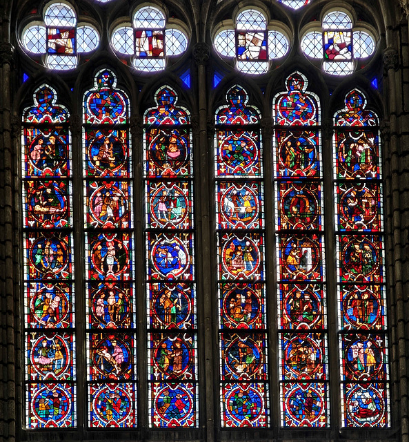 Though the stained glass windows - some dating bak to the 13th century - were dismantled and stored away for safekeeping, much of the glass was lost during the Word War 1. When after the war many of the surviving windows were sent to Paris for restoration work, an accidental fire destroyed even more. However, there are still a few original stained-glass windows in the cathedral.