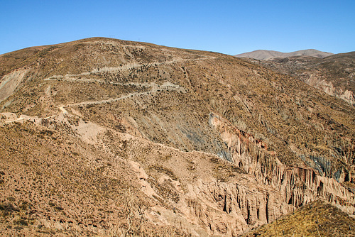 The unsurfaced toll road connecting Tupiza (2965m) and the mining town of San Vicente (4498m) is used by lorries - compared to other roads in the area it is in very good condition! The first inset shows the continuation of the road up to ca. 4000m at Cerro Huaynacancha, the photos were taken at appr. 3700m.
