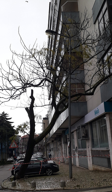 This lamp post prevented the tree from falling down, after strong wind blows. The post was slightly tilted.