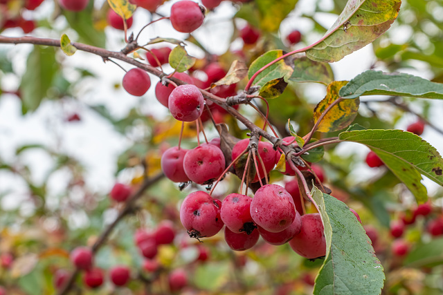 Leuchtend rot diese Früchte an einem Strauch an der Straßenbahnendstelle. Von weitem könnte man meinen, es sind Kirschen. Die Größe haben sie jedenfalls. Beim näheren Hinsehen erkennt man aber daß es Zieräpfel sind.
