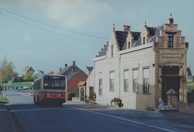 Service 744 closely follows the route of the former Poperinge to Veurne tramway opened in the 1900s as part of the Belgian Government’s policy of providing transport in rural communities. The tram line diverged from the street to reserved track to the right of the stone building which I think was an NMVB property. The trams have long gone being replaced by buses (in the early 1950s?) and NMVB has in turn been replaced by ‘De Lijn’.