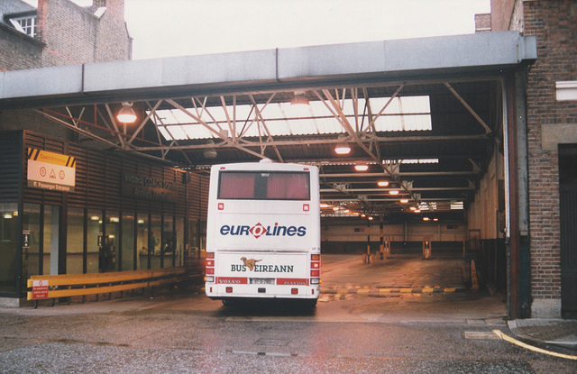 Saturday 30 November 1997 (0905) – Bus Eireann VP36 (97 D 7810), a Plaxton Premiere bodied Volvo B10m new in 1997, sweeps into the arrivals garage of Victoria Coach Station, London. It had worked the overnight Eurolines service from Dublin and was only about 5 minutes late.