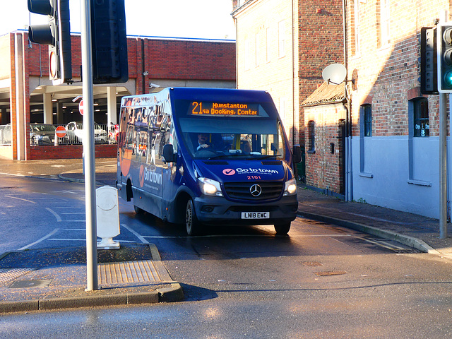 2101 (LN18 EWC) is a Mellor bodied Mercedes-Benz 516cdi new in April 2018 which is seen in Albion Street just after leaving King’s Lynn bus station.