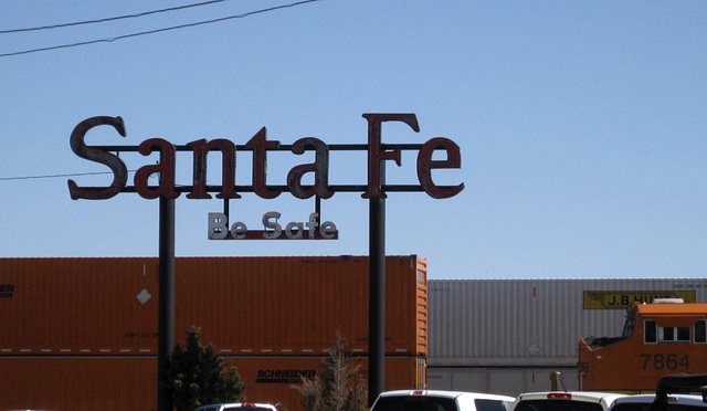 Detail of the Santa Fe sign -- it appears to be not particularly well maintained.