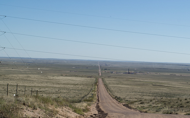 Looking south across the Pawnee National Grass(gas)lands, the electrical lines in the foreground appeared to be part of the wind turbine installation. In the large version of the picture you'll see three drilling derricks stretched along the right side of the road, a tanker truck at the first curve, and the bare outlines of a burning flare in the distance.