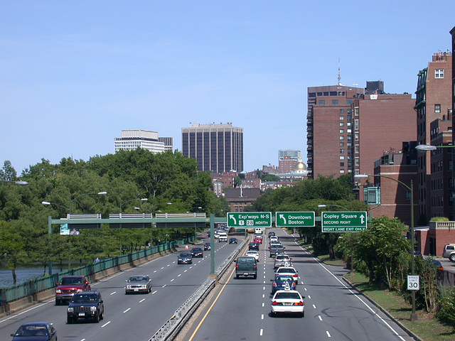 The north boundary of Back Bay is Storrow Drive (shown here) and the Esplanade, which is a park along the Charles River. The gold dome in the distance is the State House.