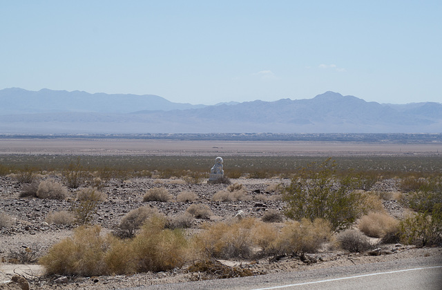 A few miles east of Amboy, in the middle of nowhere on the former route 66, what looks to be a replica of an Asian statue. There was another one about a quarter mile further east. There were no signs indicating why they were there. Considering that the road is used by some who are headed to Las Vegas, my first thought was that someone had bought them at the demolition of some Las Vegas restaurant, and then just put them here.