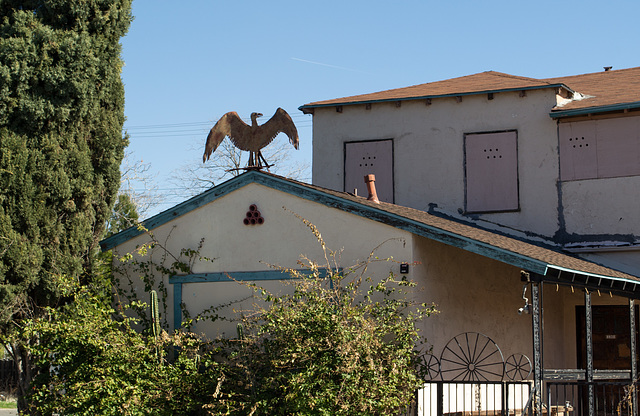 Unusual bird figure on what appears to be an abandoned building in central Banning. I'm not sure what the bird is supposed to be, but it seems too large to be an eagle so I'm guessing a California condor. See adjacent more detailed picture.