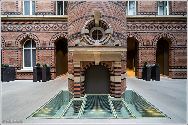 Der runde Turm im kleineren Innenhof der Alten Oberpostdirektion in Hamburg sieht an Fuße wie ein Kaminsims aus. Leider konnte ich nicht genau erkennen, was sich unter den Glasscheiben noch verbirgt. Ein Kamin ist es mit Sicherheit nicht, da im oberen Verlauf des Zylinders noch jede Menge Fenster sind. Meine Vermutung, es handelt sich um ein Treppenhaus.