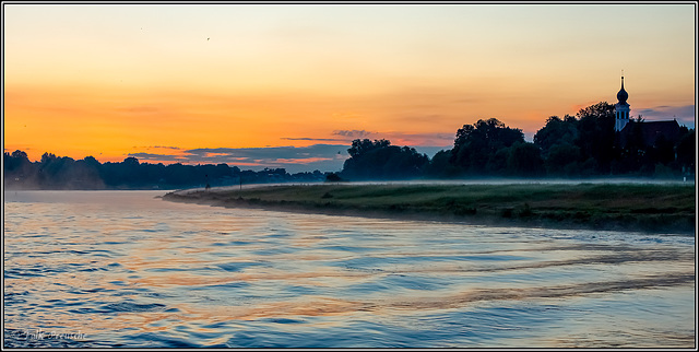 Der Elbbogen bei Hostelwitz zeigt sich hier bei fast untergegangener Sonne mit Nebelschwaden über den Elbwiesen von seiner romantischen Seite. Rechts am Bildrand ist die Maria-am-Wasser-Kirche zu sehen. Die Schifferkirche mit ihrem Zwiebeltürmchen ist sie für die Dresdner Region völlig untypisch, und deshalb so sehenswert.