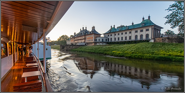Am Pillnitzer Schloss ist für unsere Dampferfahrt auf der Elbe der Wendepunkt erreicht. Jetzt geht es wieder zurück zur Altstadt. Den Fabkontrast zwischen dem Schiffsdeck und dem Schloss finde ich besonders gut gelungen.