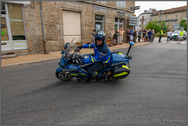 Auf unserer Motorradtour weiter in Richtung Südfrankreich sind wir in Eymoutiers von der Polizei gestoppt worden. Durch den kleinen Ort zog gerade ein Radrennen durch. Die zweiradberittene Polizei bildete die Vorhut um eine spitze Kurve im Ort.
