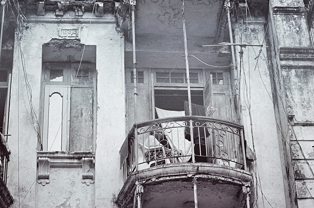 Curved iron railings stretch out from old balconies, their patterns telling of a time when Rangoon was full of grand dreams and colonial energy. The numbers above the doorway, "1922," seem to echo with stories of steamships and city life, even as the walls crumble and electric wires hang down like vines. Laundry blows in the breeze, sharing space with the tangled metal and faded stucco, the building itself holding on to history with every chipped tile and shadowed corner.