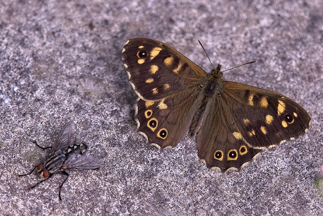 I chased this lovely Speckled Wood butterfly all round my garden trying to get a shot of it...........eventually it landed on a paving stone and I dashed in and got just one photo before it flew off..........and then I realised I had been photo-bombed by a bloody fly :-)))