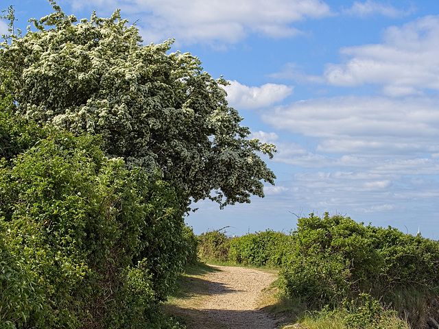 Breaking over a footpath on Hayling Island, Hampshire during a walk at the beginning of May.