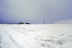 scan of a 1989 slide. Gisela geht Schlittenfahren mit die Kinder, fast eingeschneit.