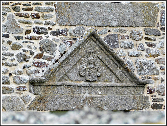 ( Le logis daté de 1754 par un chronogramme sculpté à l’intérieur du fronton de la porte ) (La porte du logis principal est surmontée d'un fronton triangulaire, dans lequel s'intègre un écu. Ce dernier est habillé d'un cimier, il est sculpté de deux sceptres fleurdelisés passés en sautoir avec pied d'hermine sur un fond d'azur.)