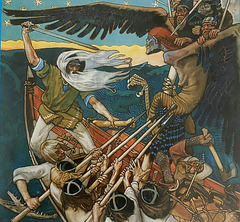 Vainamoinen fights Louhi, who is transformed into a bird, to defend the stolen Sampo. This battle is sometimes interpreted as a metaphorical fight for the soul of Finland.