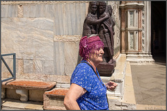 Am Markusdom in Venedig befindet sich an der Porta della Carta die Tetrachengruppe. Sie zeigt vier römische Kaiser, die damals um 300 n.Chr., in dieser Zeit entstand sie Skulpturengruppe, das römische Reiche gemeinsam regierten. Links nben der Figurengruppe ist an der Fassade des Markusdoms noch eine unscheinbare Bank zu finden, die durch das Metallgitter zum Verweilen etwas eingeschränkt ist.